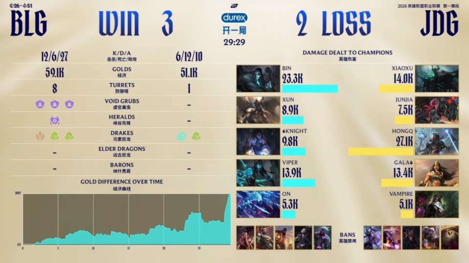 LPL在昨天迎来了大家期待已久的胜者组决赛对决,此前保持全胜的两支队伍相遇,结果JDG和BLG鏖战五局,最终BLG以3-2取胜,成功晋级第一赛段决赛。