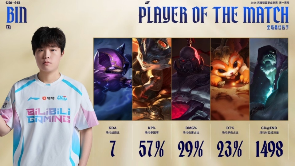 Bin是拿下了本场BO5的MVP,五把对线几乎都牢牢压着Xiaoxu打,发挥非常出色,解说也评价说这个版本Bin的对线真有点无敌了,至少在LPL是最强水准了。