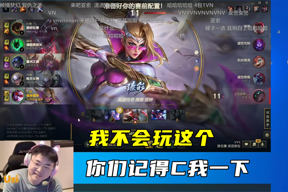 人才市场大家都清楚,主打的就是一个和陌生人自由组排,这不,Uzi加入聊天后,队友就开始自报家门,直呼:我们上路是Theshy、中路是Faker。弹幕听后也是爆笑,表示:乌兹这能忍住不说下路是Uzi?在选人阶段时,打野表示自己要选“聪明的石头人”,乌兹则在队友的支持下,还是选择了AD位,辅助拿出锤石,想让乌兹玩厄斐琉斯,乌兹却说自己不会玩,还以时间到了为借口,选了一手VN。最后更是扮猪吃老虎,表示:这个我不太会玩,到时候你们记得C我一下。