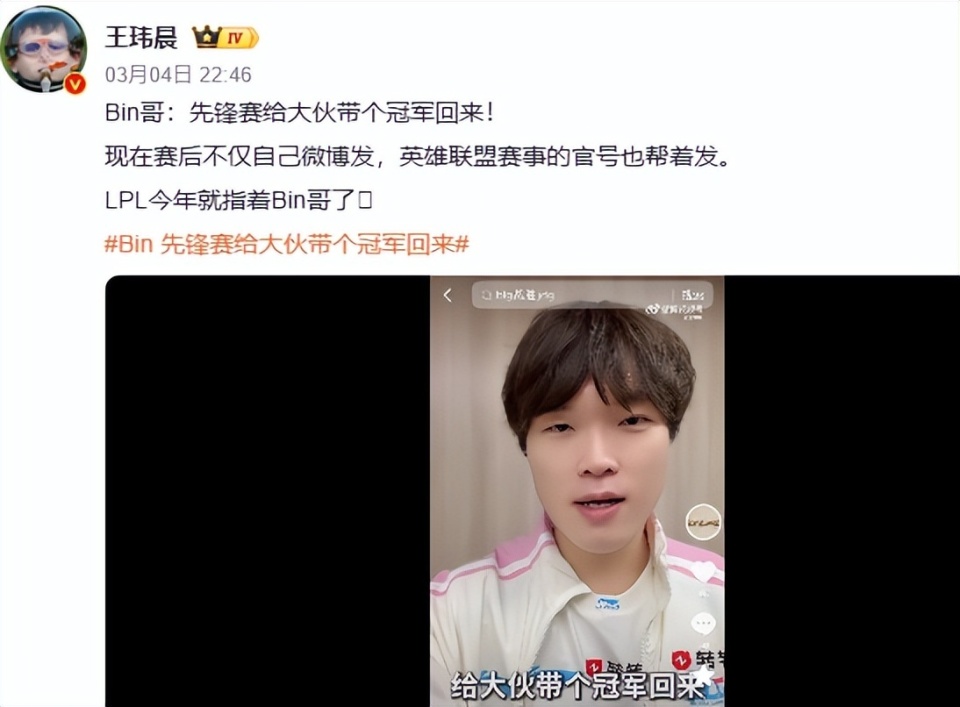 恭喜BLG获胜,也挺进了先锋赛,这不,赛后开心的Bin又整活了,直接喊话,先锋赛给大家带个冠军回来,太自信了。