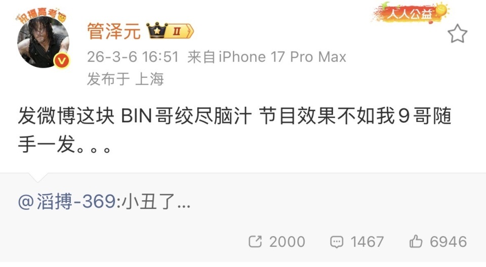 发微博这块,BIN哥绞尽脑汁,节目效果不如我9哥随手一发。。。
