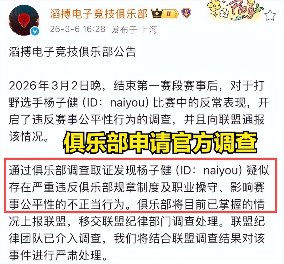 虽然小天刚开始也在为Naiyou说话,认为出振奋是为了凑齐六件套,但后续Naiyou还在补魔抗,这把小天看懵了。而就在3月6日的下午,TES战队官方账号发了一个帖子,内容主要是:“俱乐部调查取证发现Naiyou疑似存在严重违反俱乐部规章制度及职业操守、影响赛事公平性的不正当行为。俱乐部将目前已掌握的情况上报联盟,移交联盟纪律部门调查处理。”这个帖子一经发布就引起了热议,甚至登上了热搜的榜单。