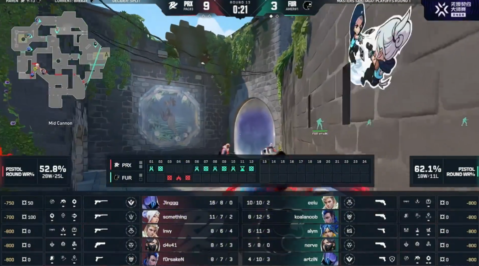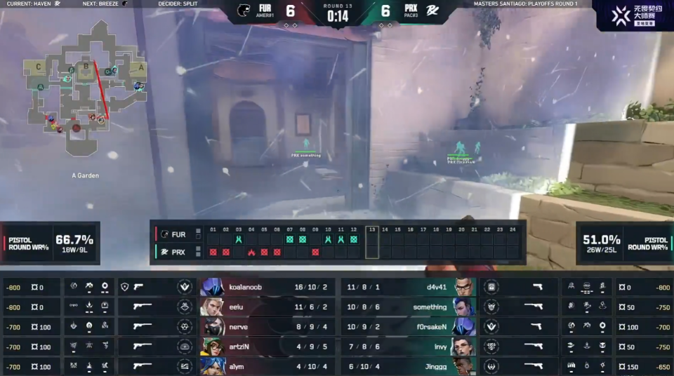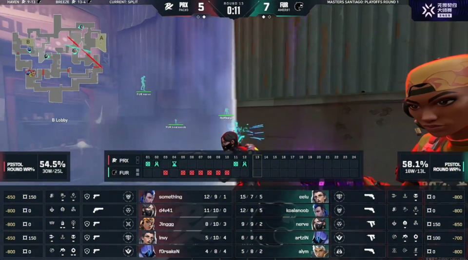 PRX打出四连胜,第10回合FUR暂停回来,FUR拿到人数优势,但something高敏时刻,回防打赢拿到三杀,并展示“经典操作”。
