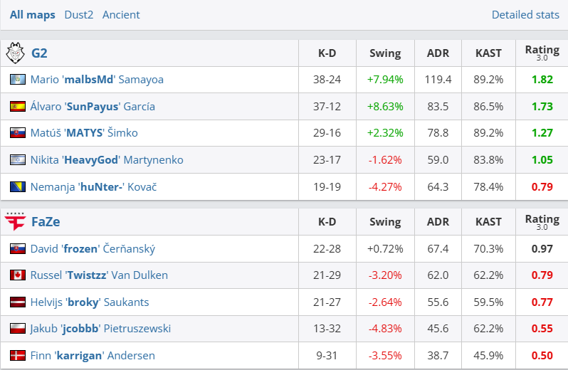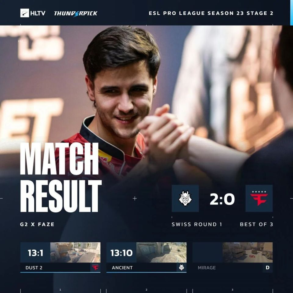 图一Dust2太阳神手感爆炸,G2全员状态在线直接以一波13-1狂潮碾压对手,FaZe五人均个位数战绩,jcobbb仅1击杀。图二Ancient,G2与FaZe半场握手言和,然而下半场G2的防线固若金汤,malbsMd各种乱杀率领G2以11-6大幅领先。虽然FaZe连续针对A区追至10-11,关键局G2中路、B区拿下人头优势取得赛点。终局太阳神开局又偷到人,G2最终笑到最后。