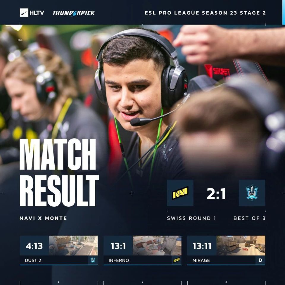图一Dust2,Monte进攻方打得NAVI如路易十六挠头——摸不着头脑,轻松先下一城。图二Inferno上NAVI也在进攻端杀穿对手豪取11分,回敬Monte一图。决胜图Mirage双方战至白热化,从5平、6平战至10平。关键局b1t用AK和格洛克打赢1V3残局,将对手打入经济局,最终NAVI以两分优势惊险取胜。