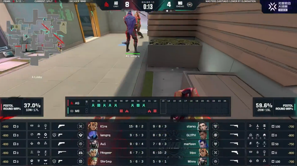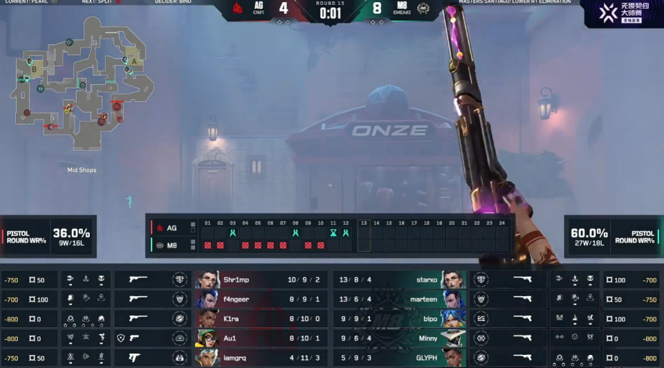 第12回合AG在A前点位顶住M8的前压,利用人数优势多条枪线打掉M8。上半场AG 4-8 M8。