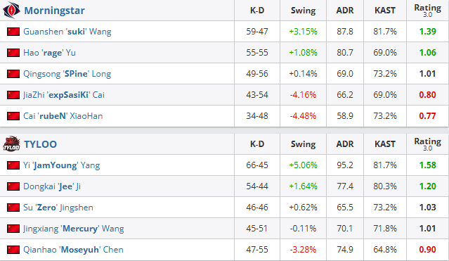 图一TYLOO选择炼狱小镇,进攻方除JamYoung以外的四人均状态慢热,半场两队战成6-6平。下半场,Morningstar在输掉手枪局的情况下完成强起翻盘,随后一度取得11-7的领先优势。但Jee在起出防守大狙之后逐渐找回状态,Mercury同样多次打出关键发挥表现,TYLOO铁血防守连拿六分,以13-11逆转先下一城。