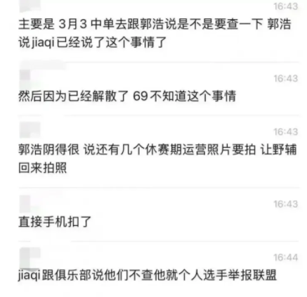 根据部分网友爆料,这次调查的起因其实来自队内的异常反馈,据称队伍双C,中单Creme与下路JiaQi,在比赛与训练过程中察觉到某些情况不太正常,因此曾向俱乐部经理郭皓提出建议,希望俱乐部能够进行调查,而另一位队员369则被网友调侃为“完全不知情的队友”。