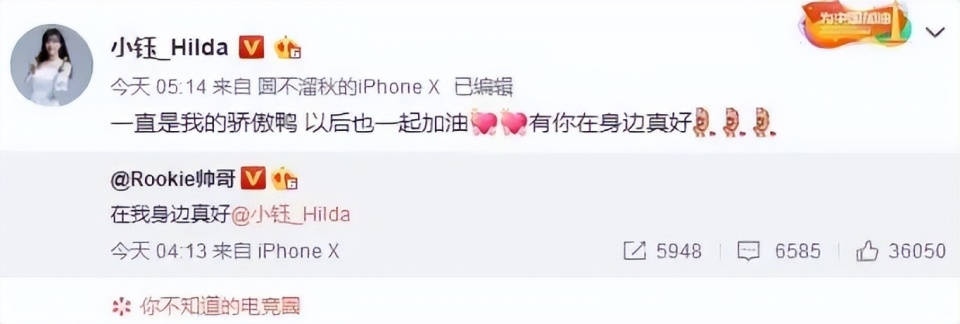 这个消息之所以让全网哗然,正因二人的感情承载了太多人的青春记忆。时间回溯到2018年11月,IG战队斩获LPL史上首个S赛全球总冠军,全网沉浸在夺冠的狂喜之中,Rookie借着这份荣光,高调官宣与小钰的恋情,一句“在我身边真好”,配上小钰“一直是我的骄傲鸭”的甜蜜回应,成为当年电竞圈最动人的名场面。彼时,一个是IG战队的“定海神针”,一个是LPL知名主持人,郎才女貌的组合收获了无数网友的祝福,被称为圈内的“金童玉女”。