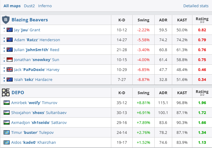 图一Dust2上wetfy手感热的发烫,DEPO完全碾压对手,一波13-1暴打先下一城。图二Inferno,DEPO在0-3后直接接管比赛,从上半场铁血防守到下半场一路平推,再度以一波13-1狂潮终结比赛。