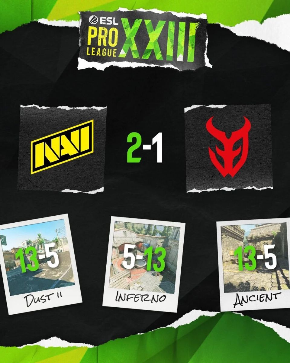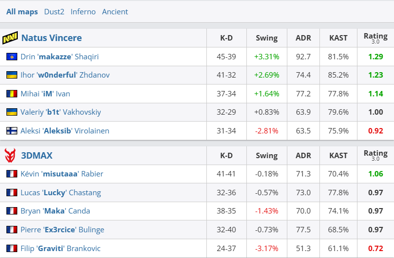 图一Dust2,法国队在赢得两个手枪局的情况下,惨遭NAVI全程碾压,仅拿5分便丢掉图一。图二Inferno,Maka领衔法国队以铁血防守半场8-4领先。换边NAVI刚拿下手枪局随即被翻,与图一的3DMAX一样,仅拿5分便溃败。决胜图Ancient上NAVI打出5-1进攻开局,长枪局Ex3rcice在中路如幽灵般3杀,法国队连追至5平。然而随后小李子、makazze、b1t轮番爆发,法国队兵败如山倒,NAVI连下8局终结比赛。