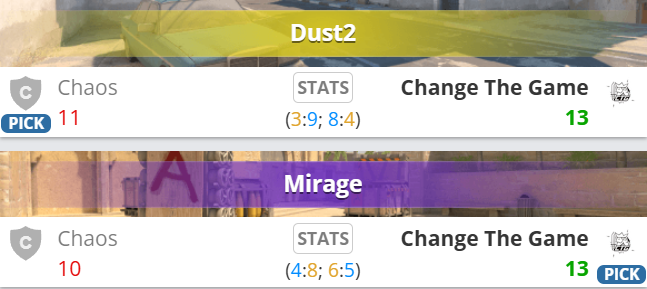 图一Dust2,0-2开局的CTG自长枪局起接管比赛,一波9-1铁血防守结束半场。换边Chaos再拿手枪局连追至10平、11平,不过CTG把握住关键局先下一城。图二Mirage,CTG打出8-1进攻开局,而后Chaos奋起直追,两队先后打成8平、10平。关键局又是CTG把握住机会,最终笑到最后。