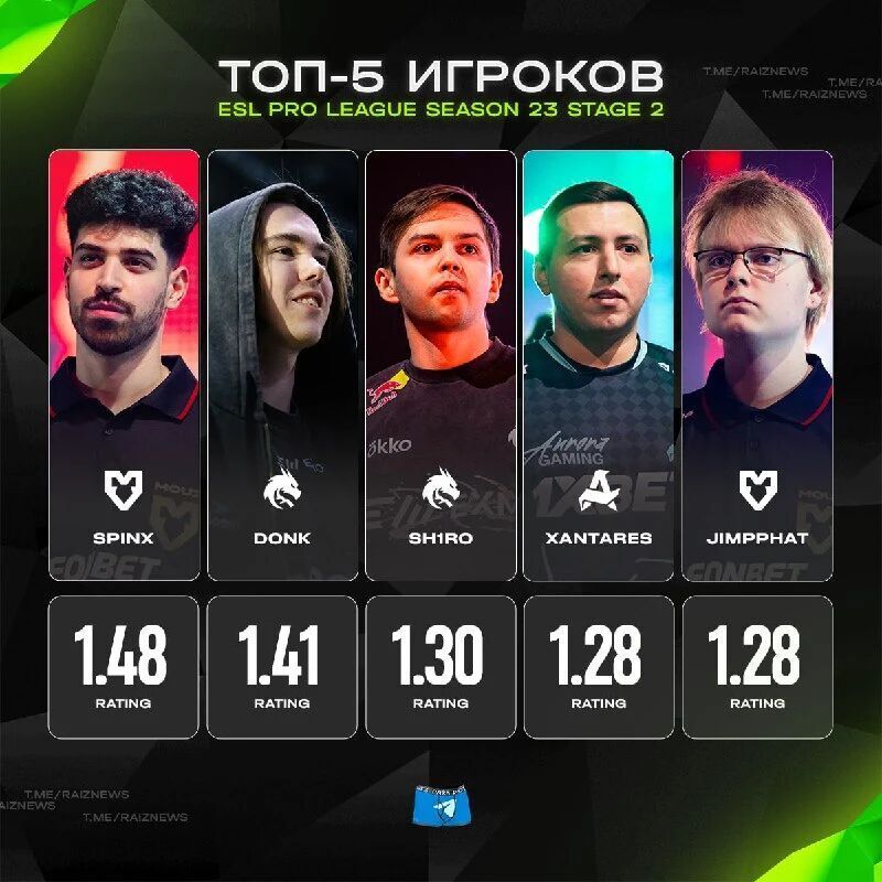 以3-0晋级淘汰赛的MOUZ和Spirit,各有两名选手进入榜单TOP5。其中Spinx以1.48的rating位列榜首,排名第二的donk数据为1.41。sh1ro以1.30紧随其后,Aurora的最大功臣XANTARES排名第四。第五名是Jimpphat。