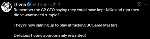 “还记得G2的CEO说过他们本可以留下NiKo,而且他们不想要也不需要s1mple吗?现在他们却要参加那该死的BCGame Masters赛事。