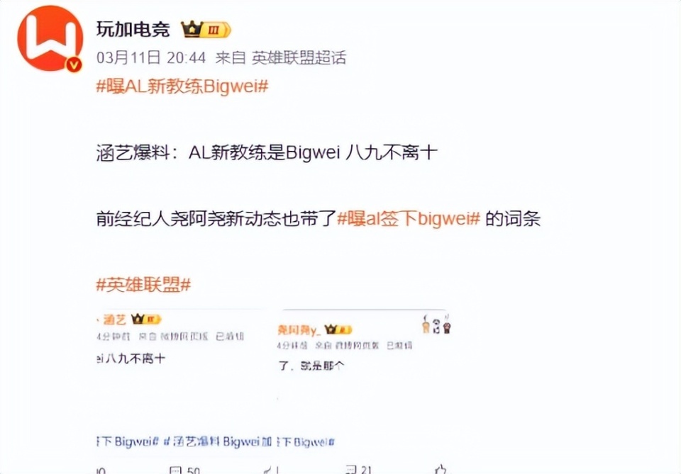 值得一提的是,除了Tabe之外,其实还有一个教练,对抗LCK战队也不错,他就是BigWei。没错,大伟教练战绩还是拿得出手的,最近AL被曝签下了这位实力教练,要知道,他可是当年差点掀翻T1的人,带领BLG拿到过世界亚军,当时可是把有着Faker的T1逼到了生死局啊,虽然最后很可惜,但是大伟教练的实力展现出来了,这次再就业,还是挺让人期待的,还是来到的强队AL。
