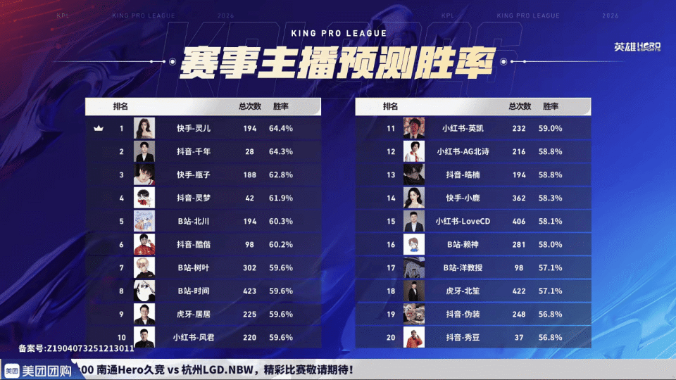 快手-灵儿胜率64.4%,位于排行榜第一。