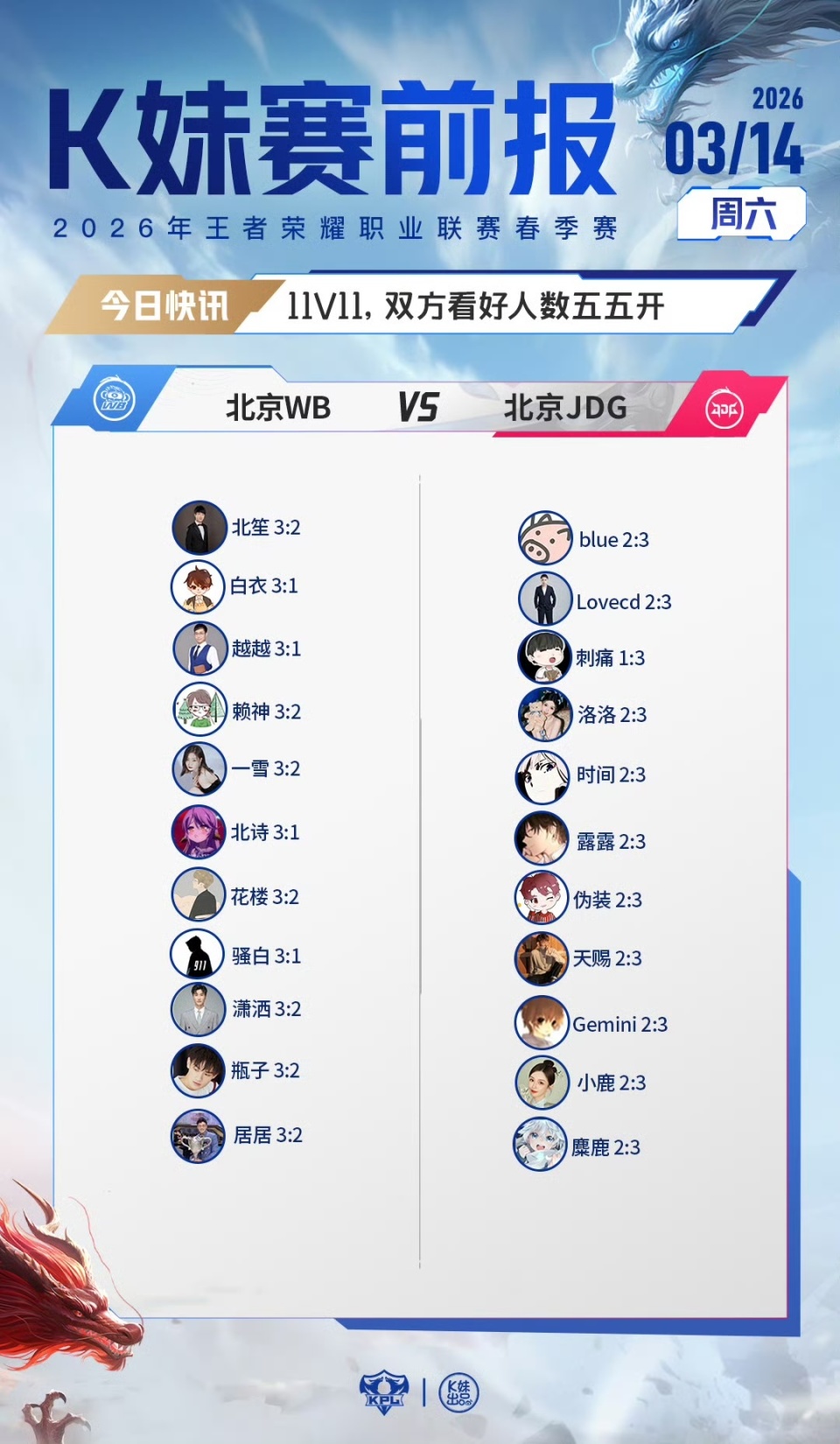 WB对战JDG:11V11,双方看好人数五五开;