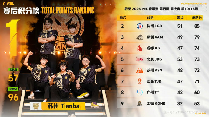 决胜时刻,信号圈缩在新工小镇附近,圈内剩余苏州Tianba战队、成都AG战队和北京WBG战队,此时场上4v3v2。WBG战队先被淘汰出局,随后剩余两队展开对战,AG战队率先倒人,Tianba战队凭借人数优势拉开枪线淘汰AG战队拿下比赛,Tianba获得本场比赛胜利。