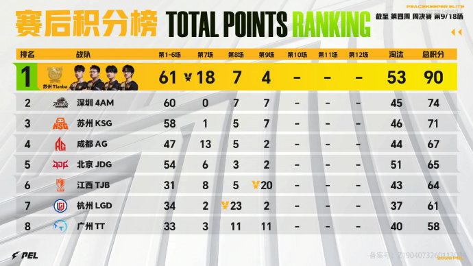 决胜时刻,信号圈缩在P城附近,圈内剩余江西TJB战队、广州TT战队和上海RW战队,此时场上4v1v1。TT战队先被淘汰出局,随后剩余两队展开对战,TJB战队86配合队友枪线精准出击淘汰RW战队最后一人拿下比赛,TJB获得本场比赛胜利。