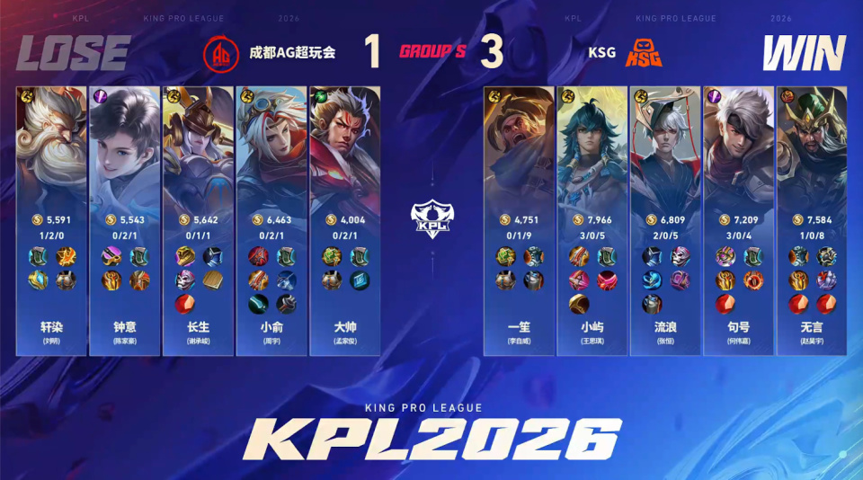 最后一波夏洛特追着关羽跑,正面4打4的团战大帅的鲁班大师先被安琪拉击杀了,关羽绕后又是二技能踩进来,钟馗一钩子钩回关羽,大司命抬手拿下人头。长生的嬴政身陷敌群也走不掉,AG一个一个倒下,KSG扳平比分。