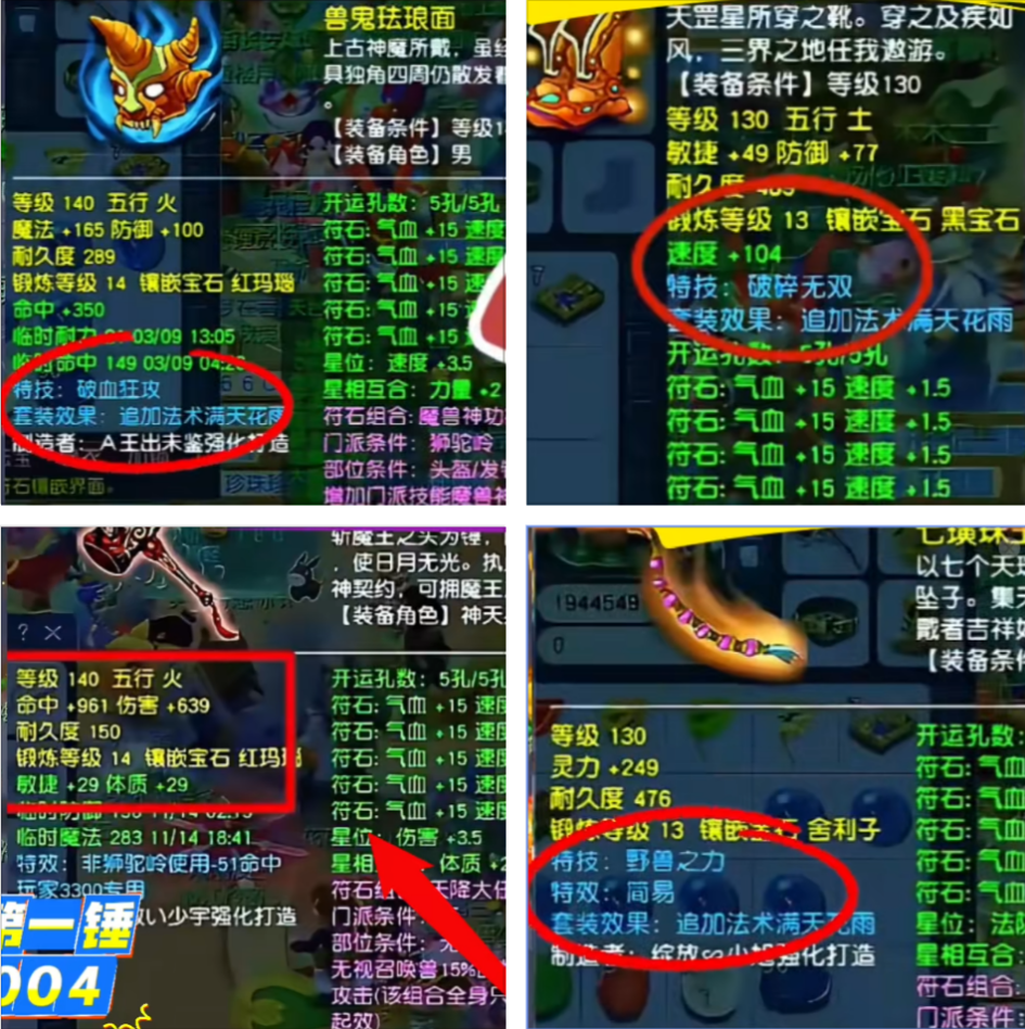 140级的破血狂攻+满天花雨男头,130级的破碎无双+满天鞋子,还有这条130级的野兽之力+简易+满天项链,最夸张的是,号称畅玩服第一武器的140级锤子也在这里!综合伤害竟然高达恐怖的1004点!这数字,光是看着就让人头皮发麻。