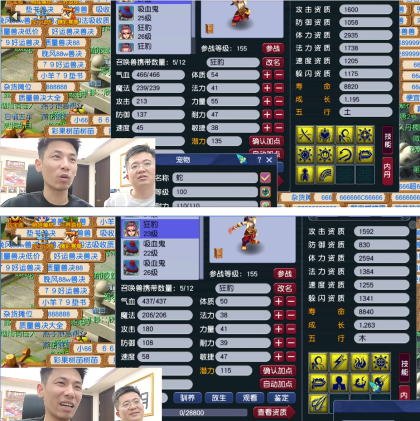 接着宝哥转战炼妖,想合几只多技能的狂豹。结果三手下去,愣是出了一只9技能和一只10技能的狂豹,资质成长都还看得过去。但宝哥自己不太满意,觉得炼妖这块的运气还是差了点意思。折腾了一会儿,他干脆放弃了,直接让老王去收顶级的胚子来打书。结果老王那边传来消息:珍宝阁上好的回炉胚子已经不多了,想出货,还得靠自己动手。