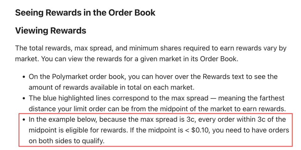 注意,如果某一边的价格低于10美分,那么你必须双边挂单才算有效。也有说双边挂单效率是单边的3倍的,我暂时没找到具体怎么算的。