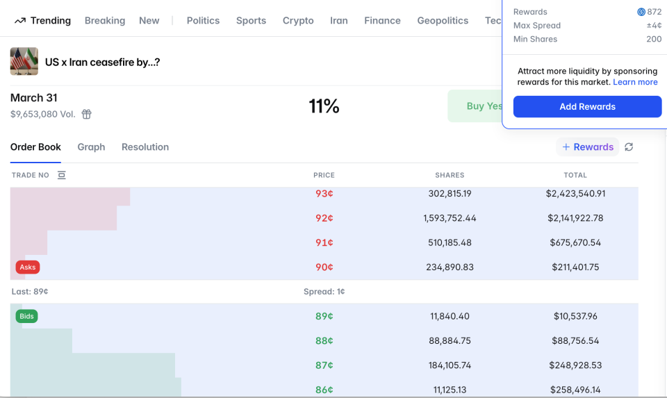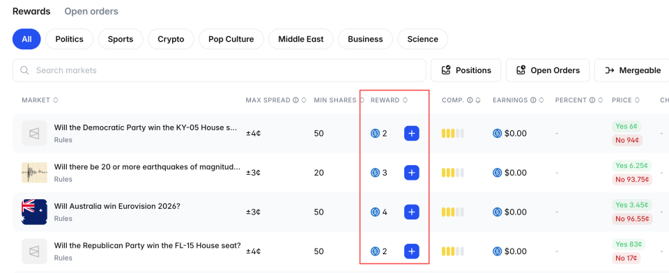 找到竞争度适中的区域,然后看奖励金额,这是该市场每日分发的奖励总额。一般来说,奖励池 $20以上的市场才值得参与,太小的市场即使你占了大头,绝对收益也很有限。