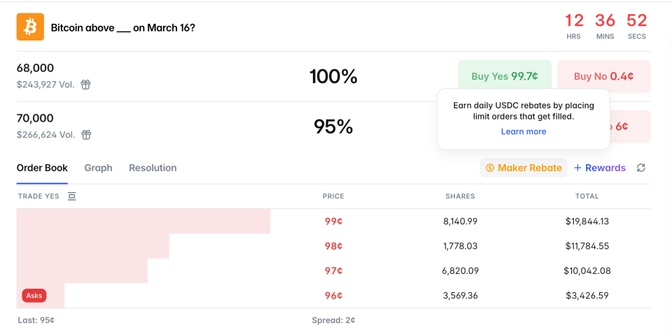 - 做市(Maker):挂限价单等待成交,部分市场为在区间内的挂单提供 LP 奖励,Crypto、NCAAB和意甲联赛的挂单成交后可获得手续费返还,详见:Maker Rebates Program。