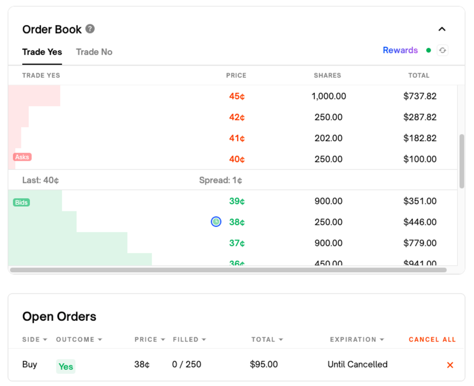 Order Book(订单簿) Polymarket 支持限价单模式,买单(Bids)和卖单(Asks)构成订单簿。做市商通过在买卖两侧同时挂单来赚取价差。有了订单簿,就会出现挂单的和吃单的这两种行为。