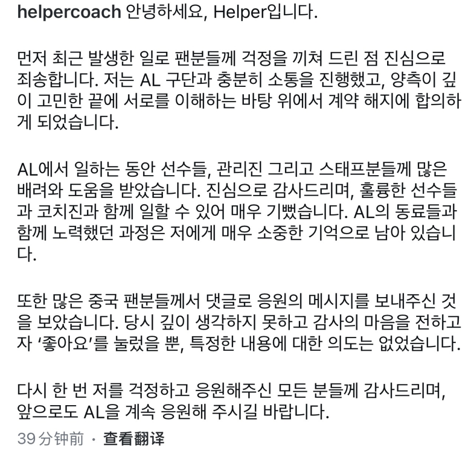 Helper回应和AL解约:点赞粉丝评论只是感谢,没有特定含义