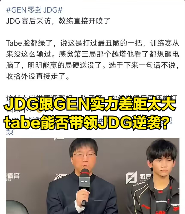 不少观众都对JDG感到失望,甚至不少AL粉丝认为JDG这是在浪费LPL赛区名额。而JDG教练tabe在近期采访当中回应JDG惨败GEN的原因。tabe认为JDG比赛没有纪律性,JDG有很多次都可以提速来打小龙或者提前站位,但是JDG却一直没有行动反而陷入到GEN的运营节奏当中,tabe采访表示JDG输给GEN的过程过于丑陋,认为JDG选手没有把训练赛的内容完全打出来。