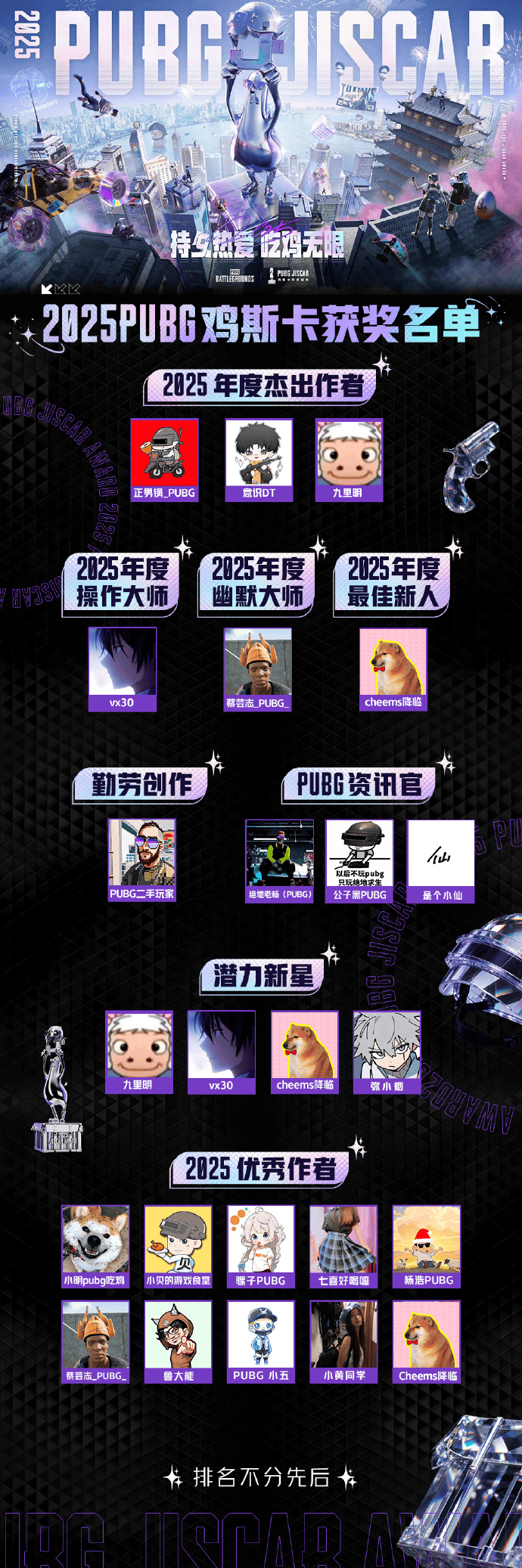 恭喜所有获奖作者、主播及合作伙伴!是你们以创意为光,点亮PUBG生态,让每一份创作都成为高光时刻!