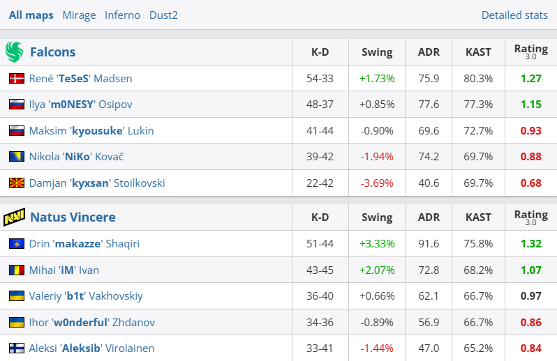 Rating 3.0:HLTV的综合评分,基于击杀、伤害、生存、KAST、多杀和Swing等要素。