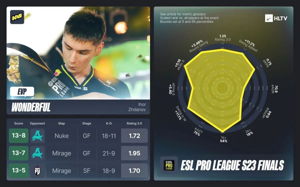 在对阵FUT的比赛中,他在Mirage上取得了1.70的rating也为他加分不少,而w0nderful在淘汰赛中的六场巅峰表现也让他成为了MVP的有力争夺者。