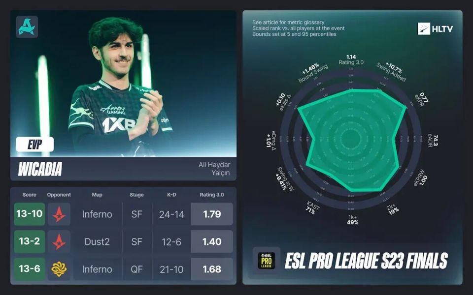 即便决赛表现不佳,这个榜单的评选标准依旧是带领队伍前进,而Wicadia在斯德哥尔摩的比赛中正是如此,他在队伍赢得的全部四张地图中都发挥了关键作用,Rating高达1.56。
