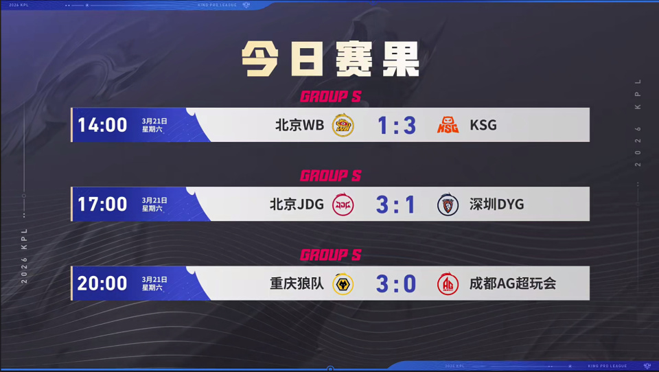 3月21日的三场S组比赛已经结束了,也意味着,S组常规赛的比赛全部结束了。最终,S组的排名也出来,分别是:JDG,狼队,KSG,AG超玩会,WB和DYG!原本以为S组这三场比赛,会给大家带来非常精彩激烈的对决,谁能想到,结束得如此之快!