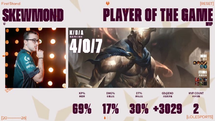 开局双方打野同时抓下,女枪拿下一血,随后G2长时间保持较小的领先优势。关键的大龙团,Skewmond抢下大龙,G2打出0换4,随后G2一波结束比赛拿下第一局的胜利!