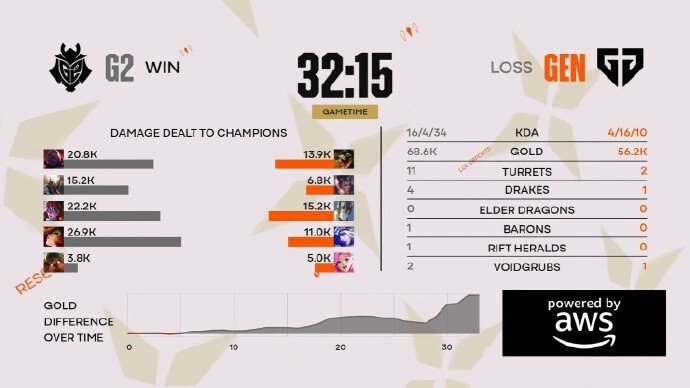 在第一条小龙的争夺上,Skewmond打残Canyon,Caps跟上收掉拿下一血,Kiin随后也被抓死。15分钟节点,Skewmond皇子单进野区击杀妮蔻,与此同时Chovy上路遭到BB单杀。25分钟打出1换4后,G2收下大龙,Kiin格温更是惨遭戏耍。拿下龙魂后,G2一波推掉GEN基地晋级决赛!