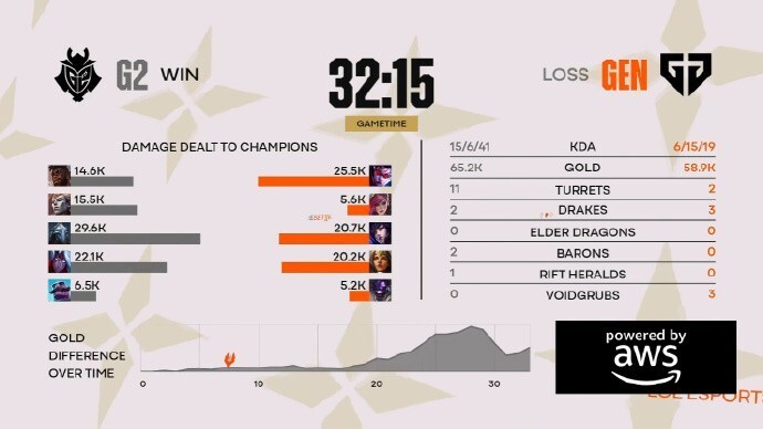 本局G2下路对线状态非常好,配合打野支援两度拿下人头。此后Canyon站了出来抓人成功,但G2利用先锋在其他路换到经济。进入中期后,Kiin的薇恩没有任何作用,连续几波被抓死,在打出一波0换4后,G2拿下大龙,虽然第一波推进被守住,但G2利用最后一点增益时间推掉GEN基地,拿到三个赛点!