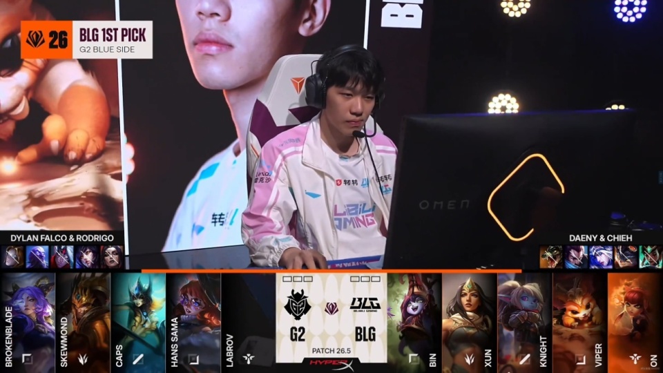 人头互换的情况下,BLG掌控小龙资源,G2拿下三条巢虫,随后的先锋博弈中,BLG出现失误,站位犹豫被G2先手抓机会击杀辅助,随后又击杀Viper。