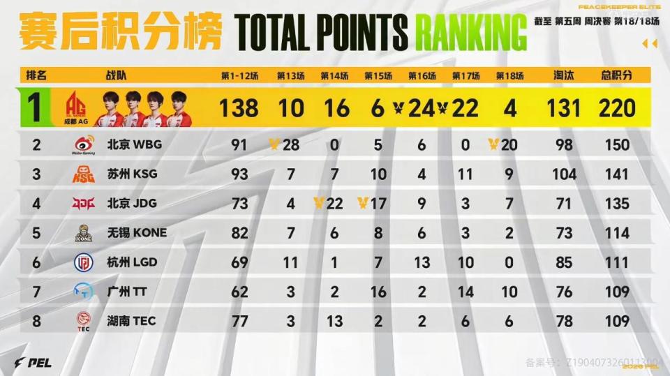 虎扑03月22日讯 3月22日积分榜:AG破纪录榜首WBG第2,TT/TEC无缘直通周决。具体积分如下:
