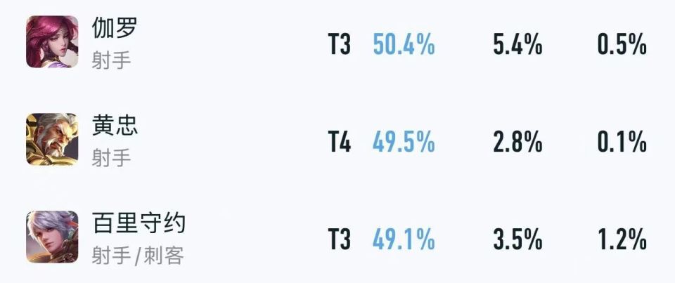 尤其是巅峰赛的伽罗,黄忠和百里守约,出场率更是低得可怜,说明即便是绝活玩家用他们都得反向冲分。