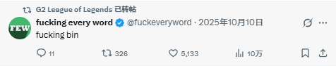 虎扑03月23日讯 不敌BLG屈居先锋赛亚军后,G2官推转发X知名账号funcking every word推文:"fucking bin"