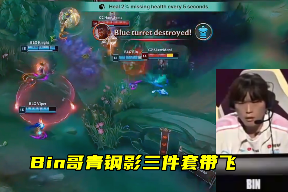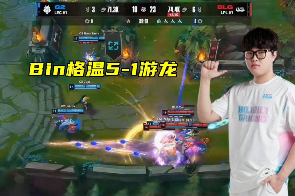 这不,在xun潘森的几波gank下,bin的格温发育超前。而xun也没有闲着,下路也是光顾了好几波,把飞机都给越塔越麻了。然而G2就算是落后了6K经济,近期的火热手感也令他们韧性拉满,BLG打了近40分钟才将其拿下。第三局比赛,这局G2给bin把武器放了出来,前期打野剑魔入侵野区还被逮,可以说是节奏大乱,被BLG追着砍,有了一丝前几天被零封的感觉。最终在Bin哥武器越高地1V4砍下三杀后,bin成功带队拿到赛点。
