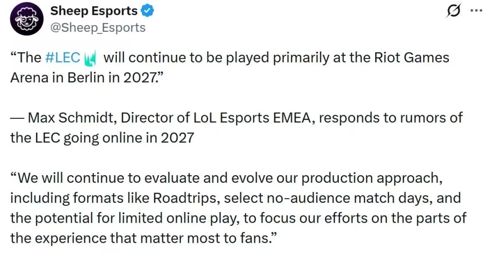 G2今年先锋赛的战绩,毫无疑问是拯救了,濒临死亡的赛区,被BLG零封的时候,外网爆料,拳头明年要取消,LEC赛区的线下赛,但看到G2双杀LCK队伍之后,拳头改变想法了,近日负责拳头电竞板块的总监发文:LEC 2027年,会继续在柏林拳头游戏竞技场举行,也就是保留线下赛。