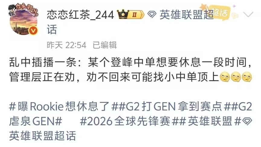 Rookie第二赛段不打的话,后面应该也不大可能回来了,俱乐部现在正在劝,但他估计也不敢回来,只要登上赛场肯定就要被骂,搞不好他会就此隐退,在LCK结婚生子享受生活了,在LPL赚了这么多年的钱,应该早就财富自由了吧。