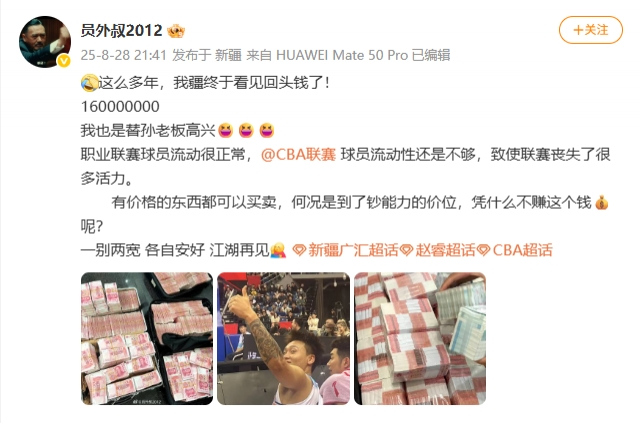 此外,新疆博主员外叔也晒出赵睿和一堆钞票的图片,透露新疆在赵睿的交易中拿到了1.6亿人民币。虽然暂不知晓这则消息的真实性,但考虑到此前引进周琦就花了超过5000万,刚刚在亚洲杯上证明了自己的赵睿,此番能让新疆这样的土豪球队放手,费用与周琦相比,绝对只高不少。
