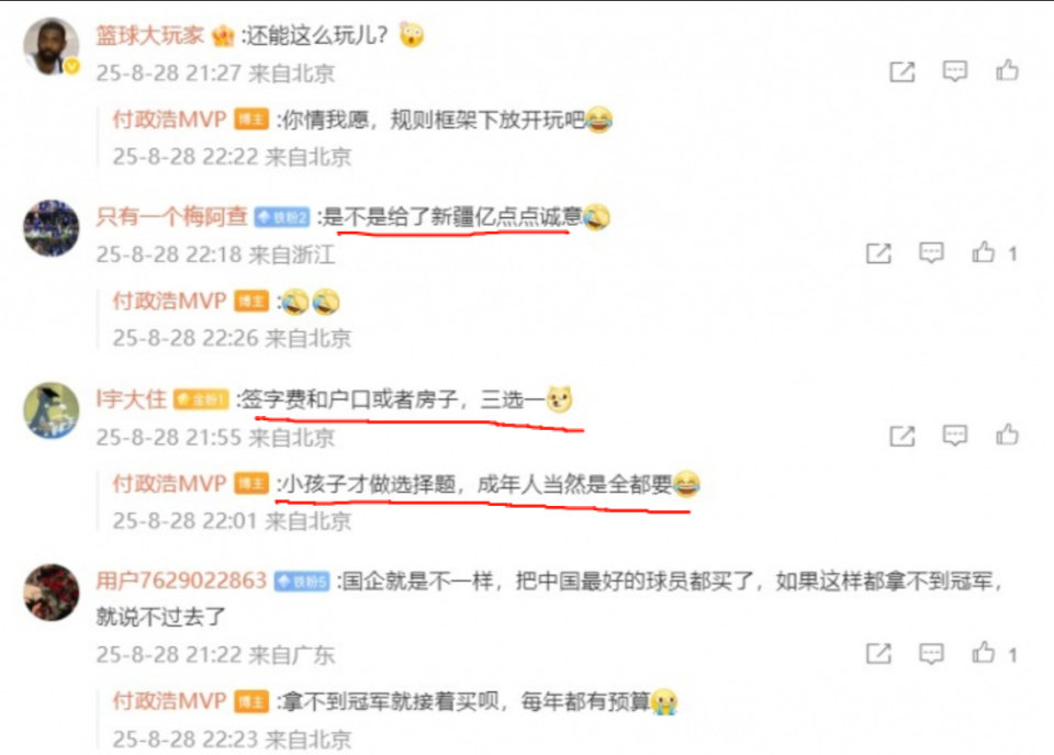 随后媒体人付政浩也发文谈到了赵睿加盟北京的交易,并且表示北京方面祭出满满的诚意,而新疆深谙“强扭的瓜不甜”的道理,只能选择尊重赵睿本人意愿。有网友也在评论区写道:“签字费、户口、房子三选一”,而付政浩则是回复:“小孩子才做选择题,成年人当然是全都要。”另外也有网友表示在满满的诚意面前,顶薪只是零花钱,付政浩也回复:“你悟了。”