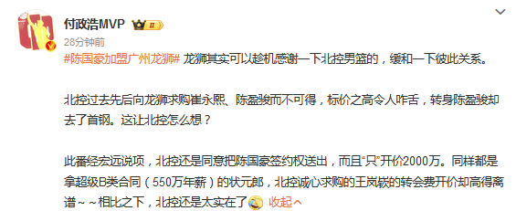 根据此前媒体报道,广东男篮花费了2000万获得陈国豪的签约权,创造状元签的价值成交新高。